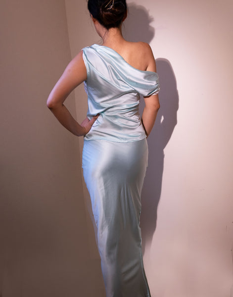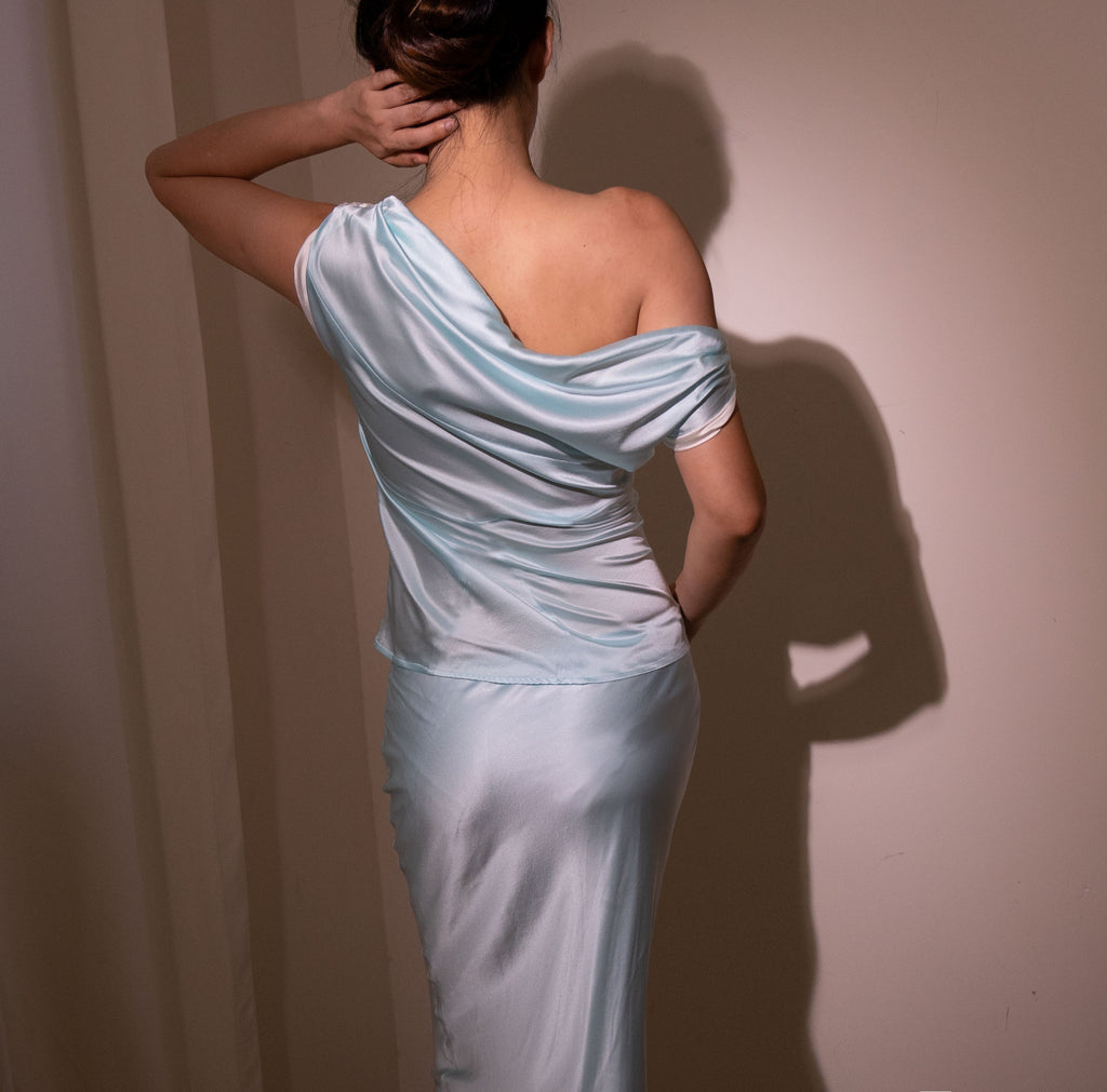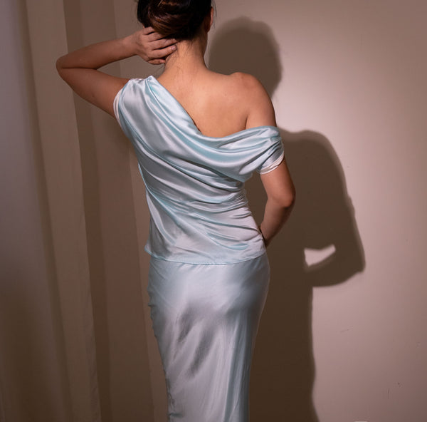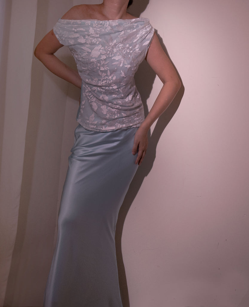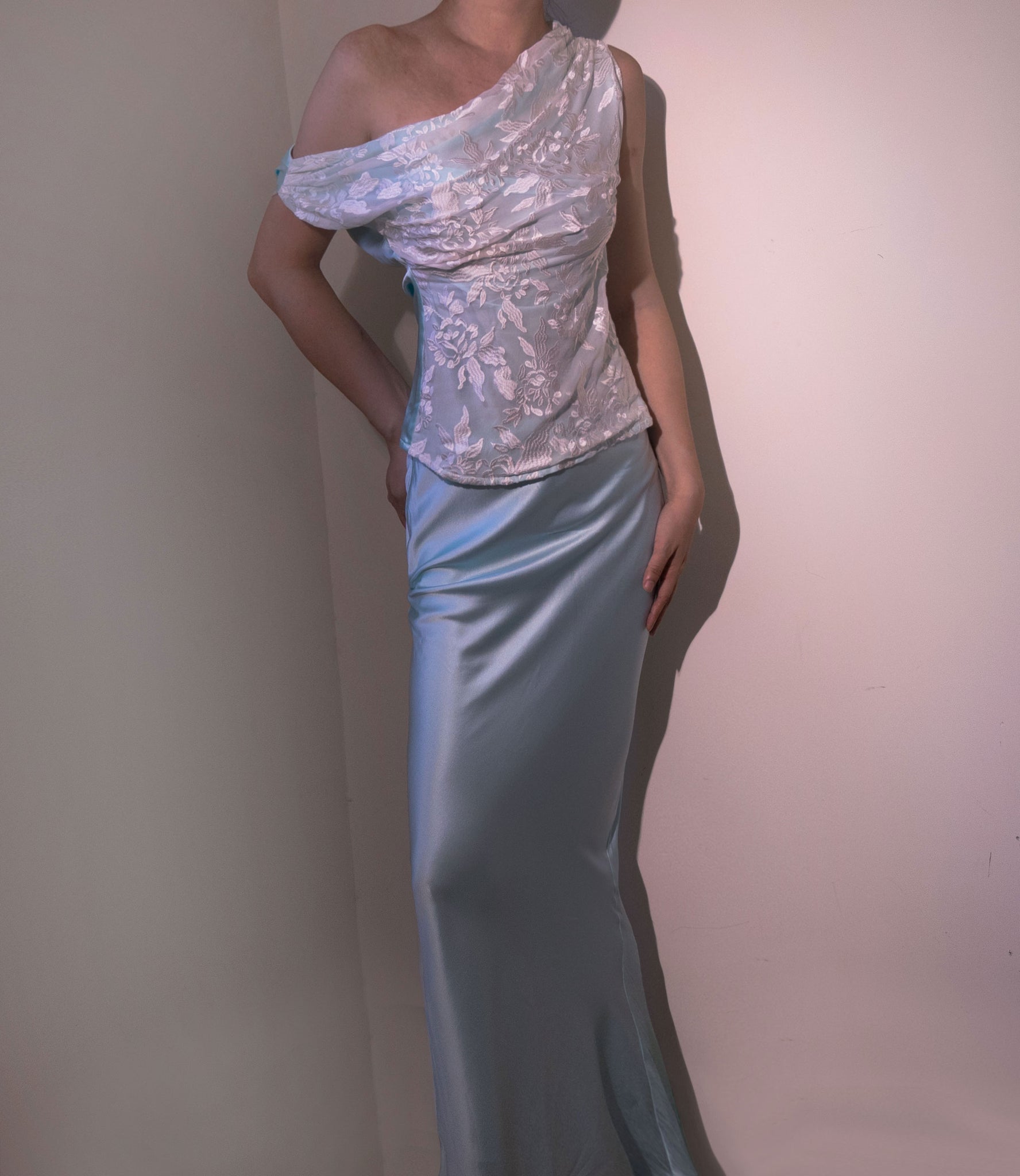 The top of the Arena boasts intricate pleated mulberry lace silk, adding a touch of elegance and sophistication. The skirt is a long flowing masterpiece, made of luxurious blue silk fabric that drapes beautifully and moves effortlessly with every step. The combination of the intricate lace and flowing silk creates a stunning and eye-catching look that is sure to turn heads.