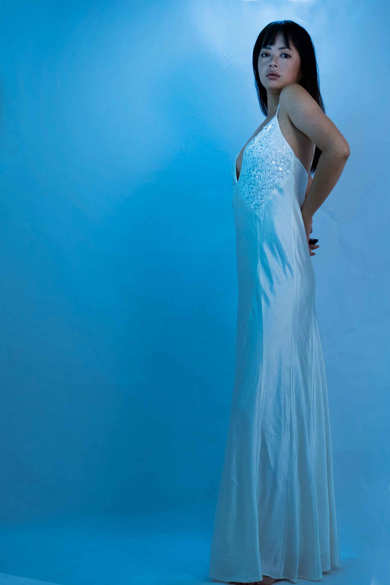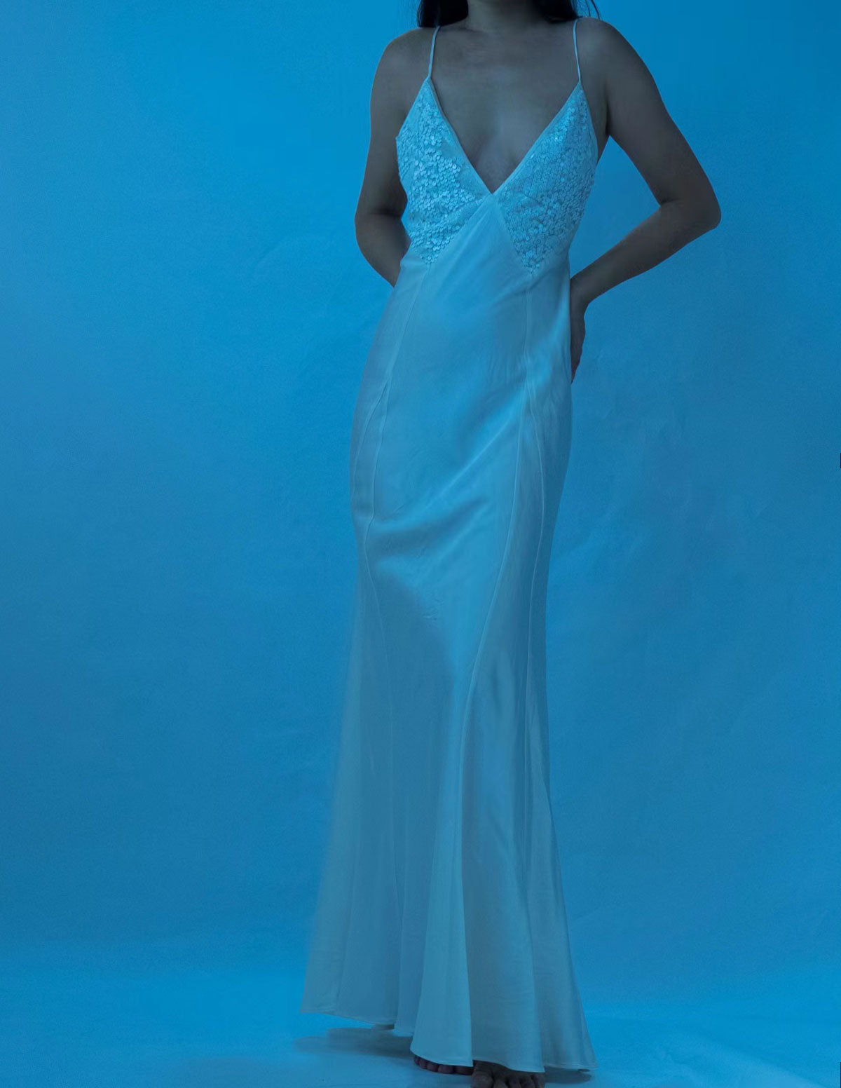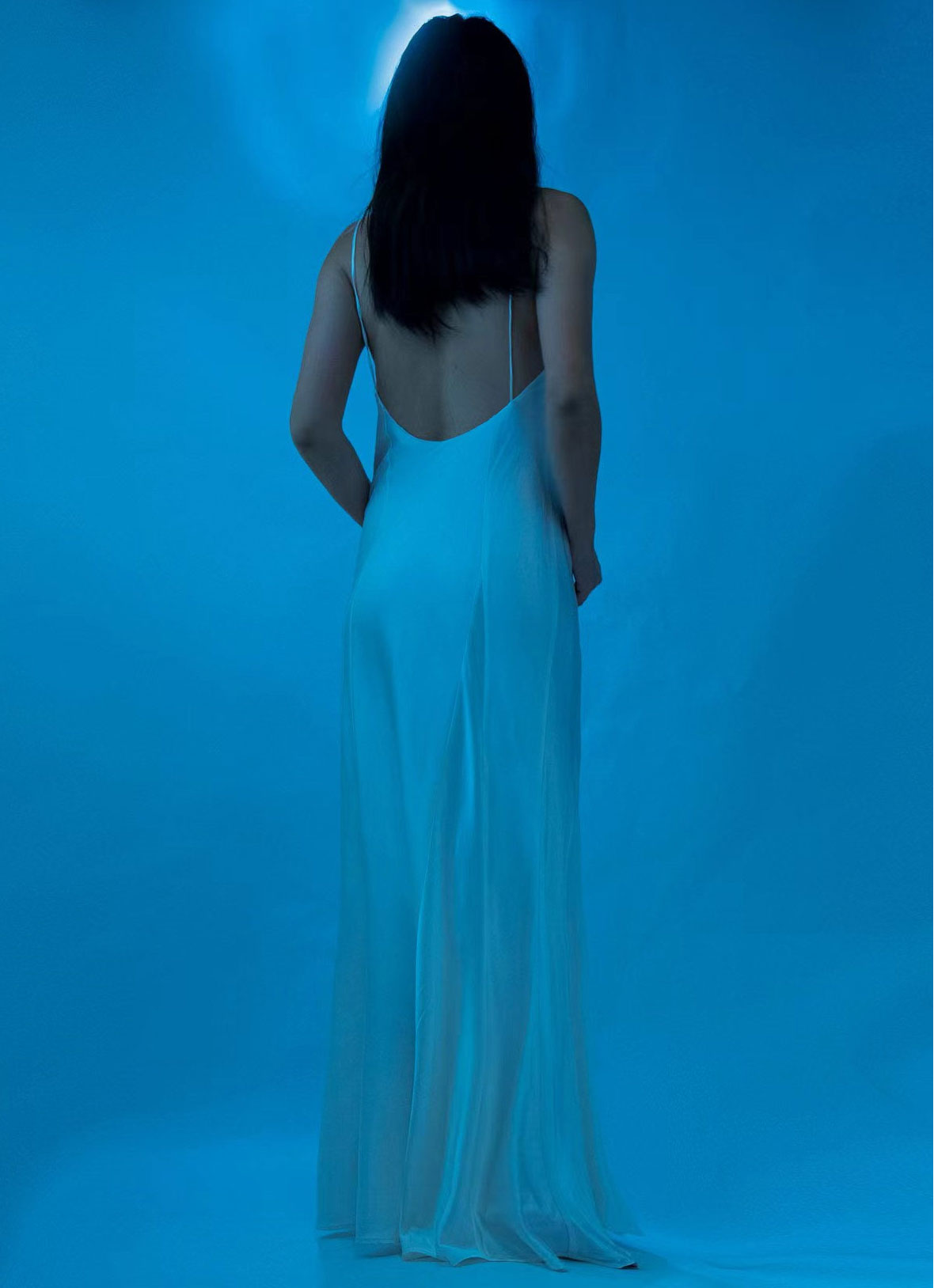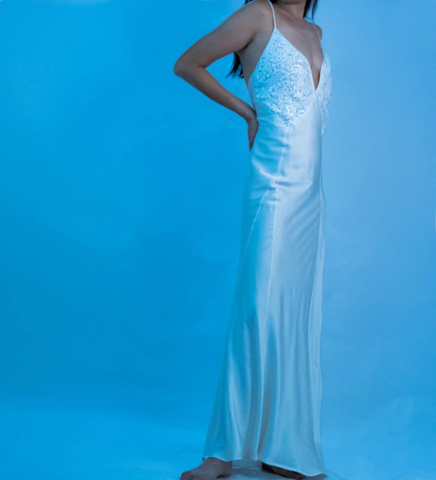 This "Chenauh" dress is cut from mulberry silk chemise and embellished with sequin fabric, it's designed to hug your figure and has a deep V-neckline with slim straps.
