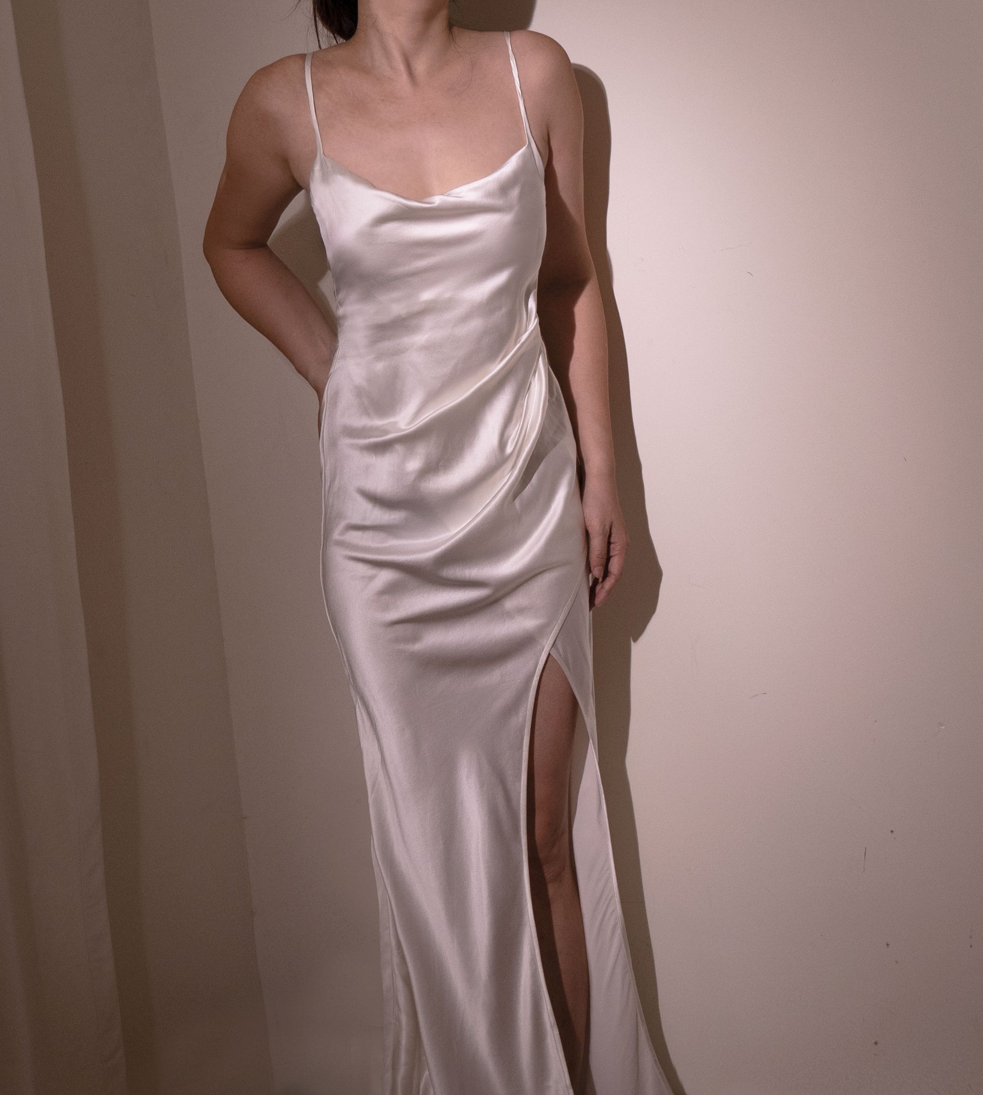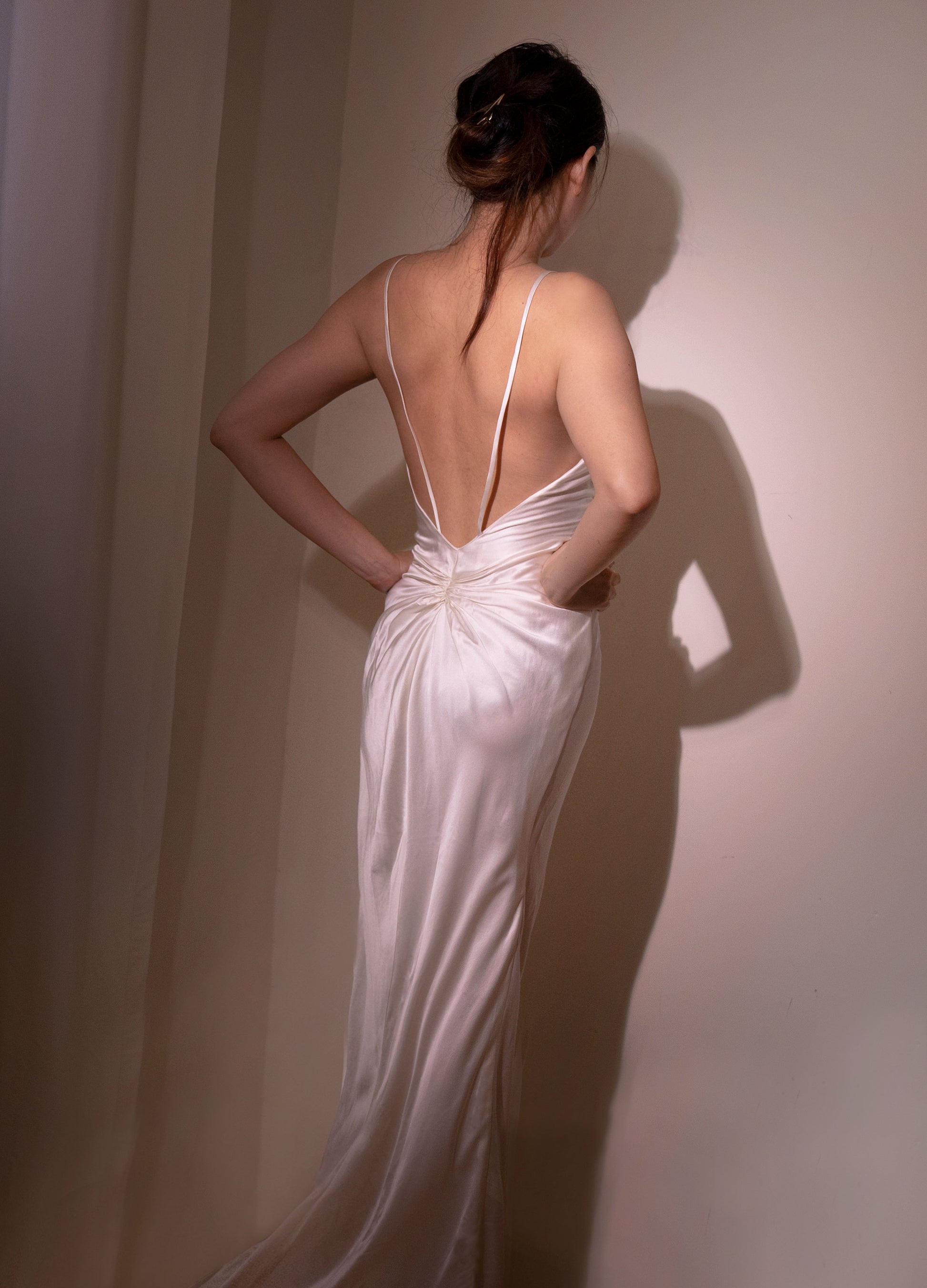The Asia dress is the epitome of glamour and sophistication. This dress is finished with fine silk straps, an elegant bodice, and cowl neckline details. The center-back ruching and fit-and-flare silhouette accentuate your best assets. Our Made-to-Order Standard Asia comes with spaghetti straps, luxurious lining, and a 20cm train. Whether you're walking down the aisle or attending a black-tie event, the Asia dress is sure to make a statement and leave a lasting impression. With its luxurious details and impeccable fit, this dress is the perfect choice for the modern woman who wants to feel confident, beautiful, and unforgettable.