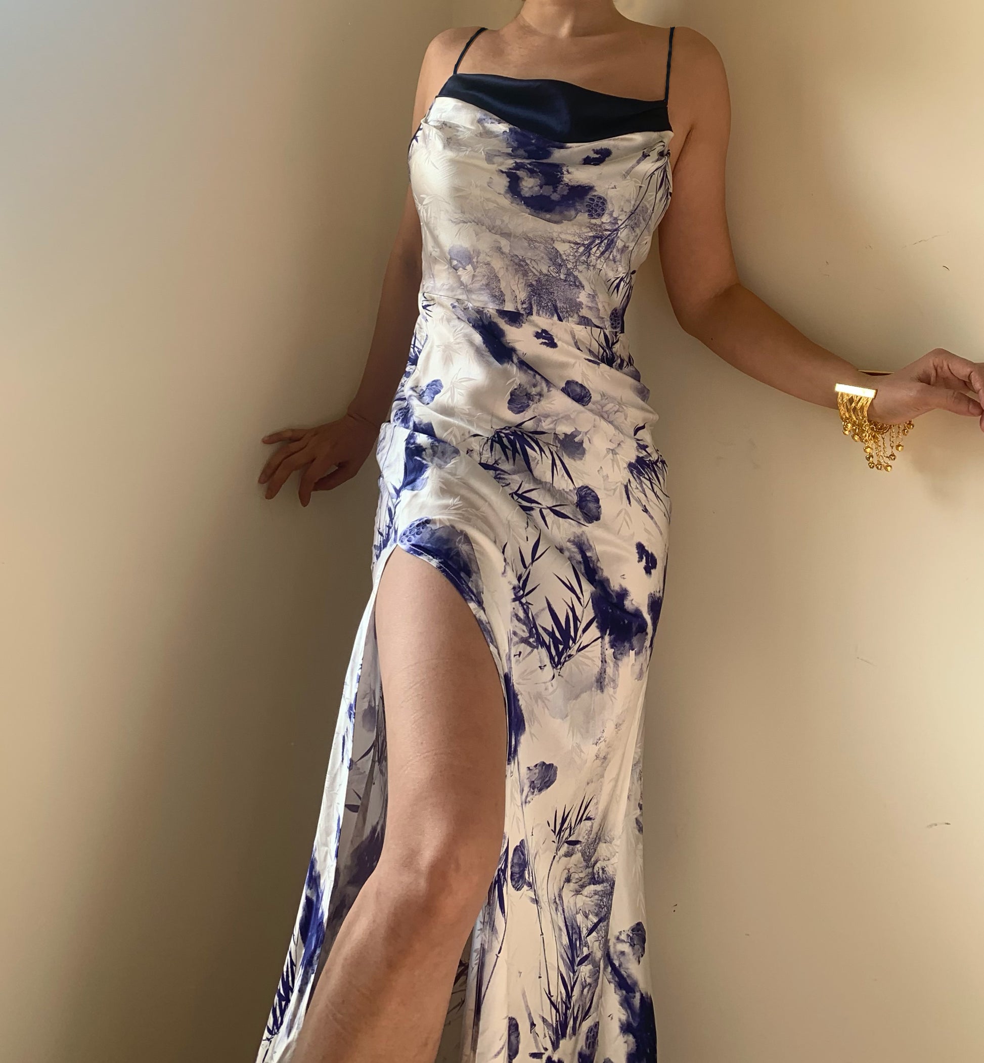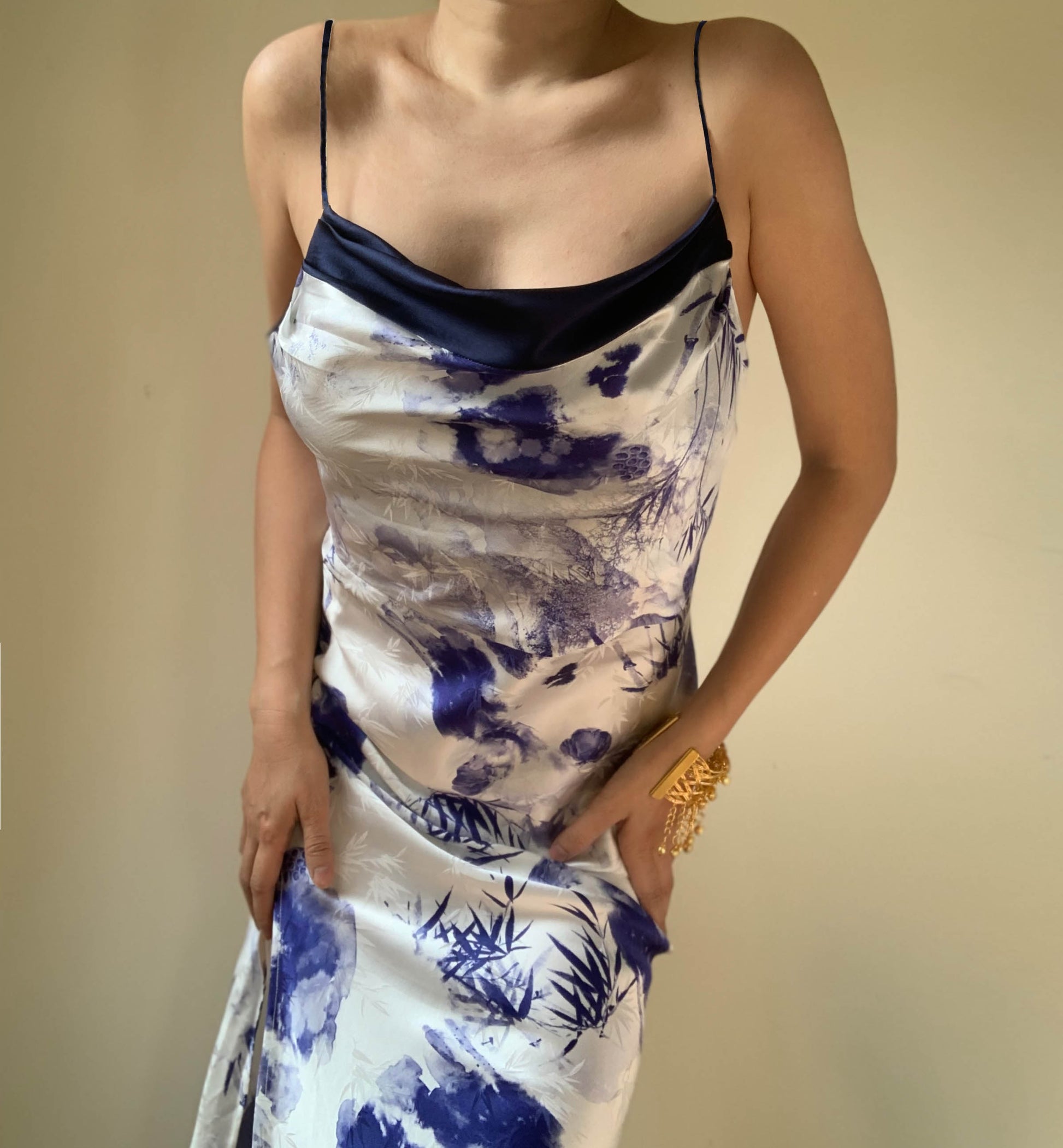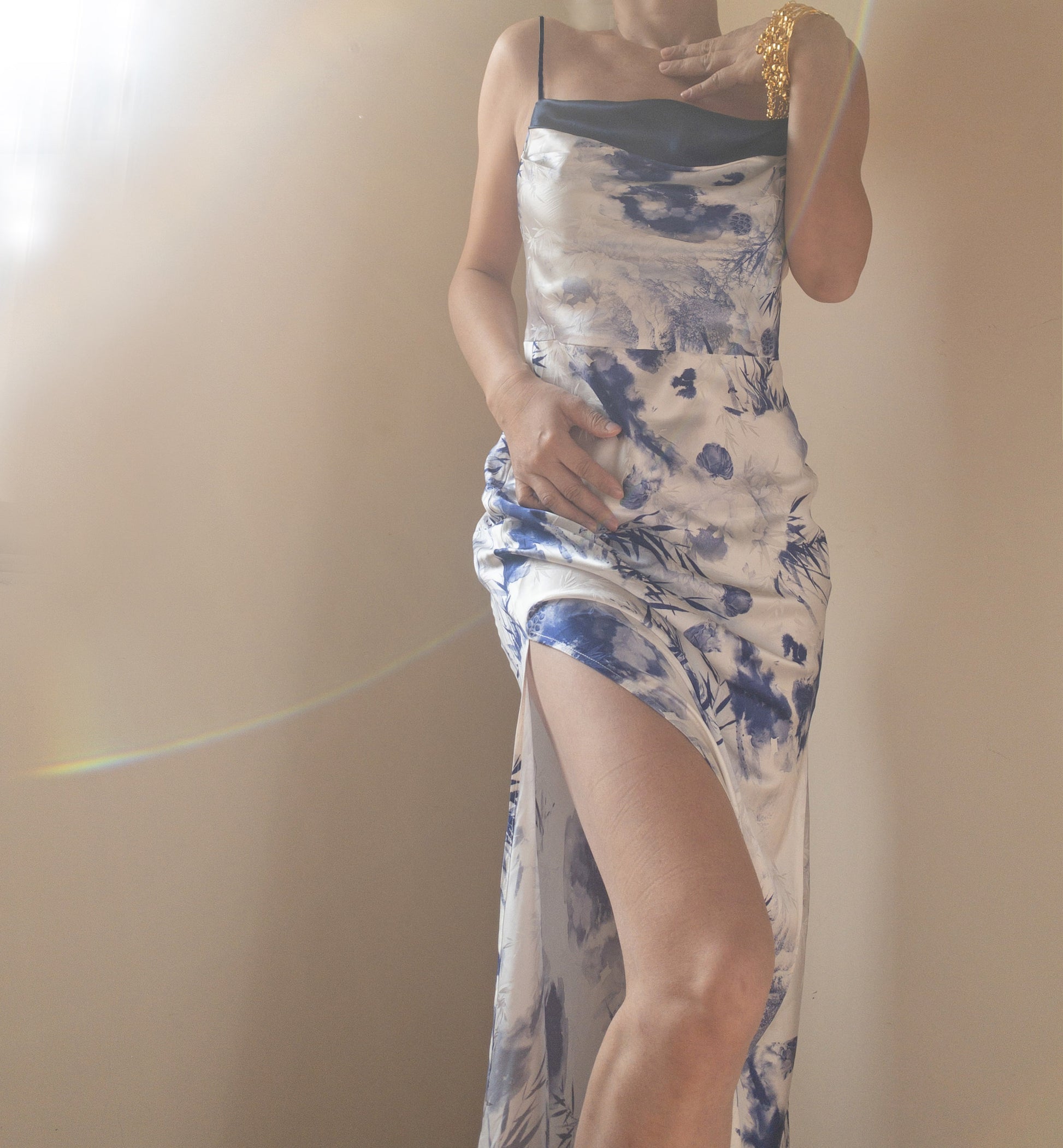 The design features an elegant cowl neckline adorned with delicate ruffled details, echoing the song's romantic mystery. Its bias cut sculpts a figure-flattering silhouette, while the graceful side slit adds a touch of liberation and fluidity with every step.