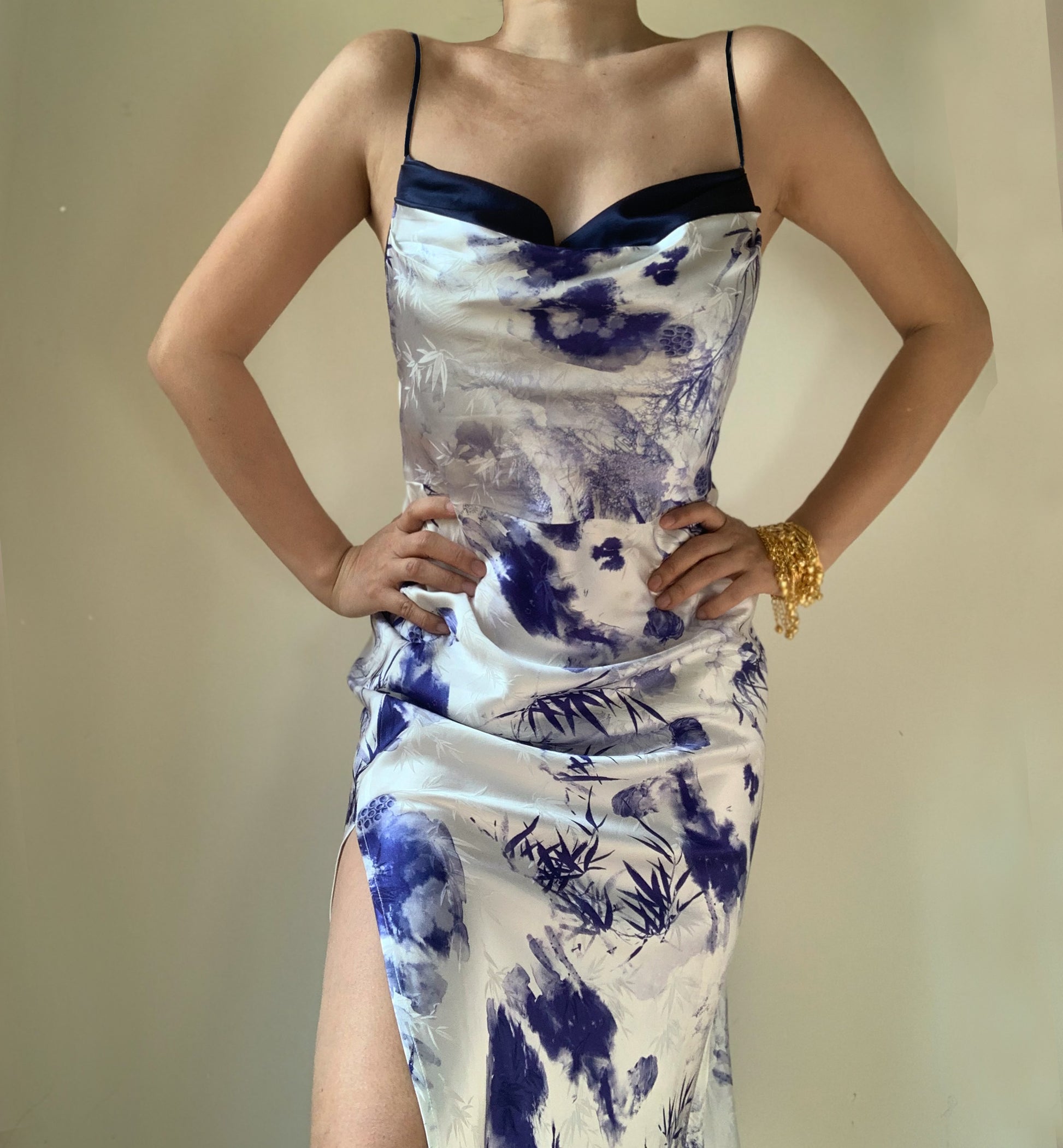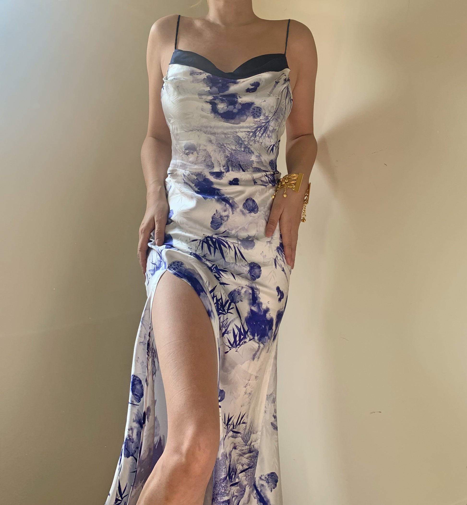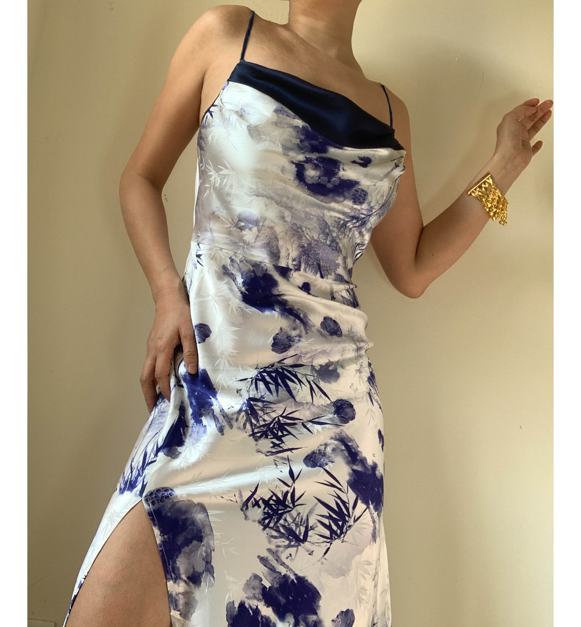 The design features an elegant cowl neckline adorned with delicate ruffled details, echoing the song's romantic mystery. Its bias cut sculpts a figure-flattering silhouette, while the graceful side slit adds a touch of liberation and fluidity with every step.