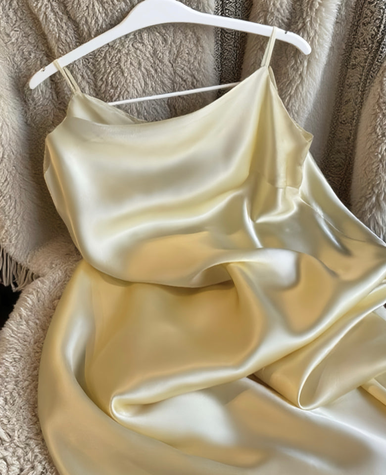 This limited-edition chemise is crafted from the finest premium 19 mommy mulberry silk, offering an unparalleled experience of luxury. It is available in an exquisite, sophisticated shade of Butter Yellow—a warm, soft, and creamy neutral that evokes elegance rather than a bright tone.
